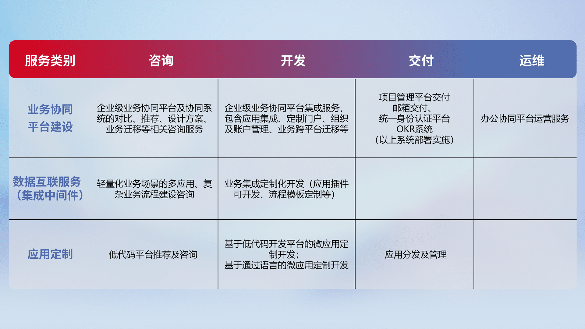 针对钉钉、、、、企微、、IDaas等平台级产品提供产品的规划、、、方案、、、交付、、定制化开发等服务,,实现如统一协同办公、、、、智能客户服务、、、、混合会议管理、、、智能数据查询、、、、等业务场景,,实现数字化转型。。。。